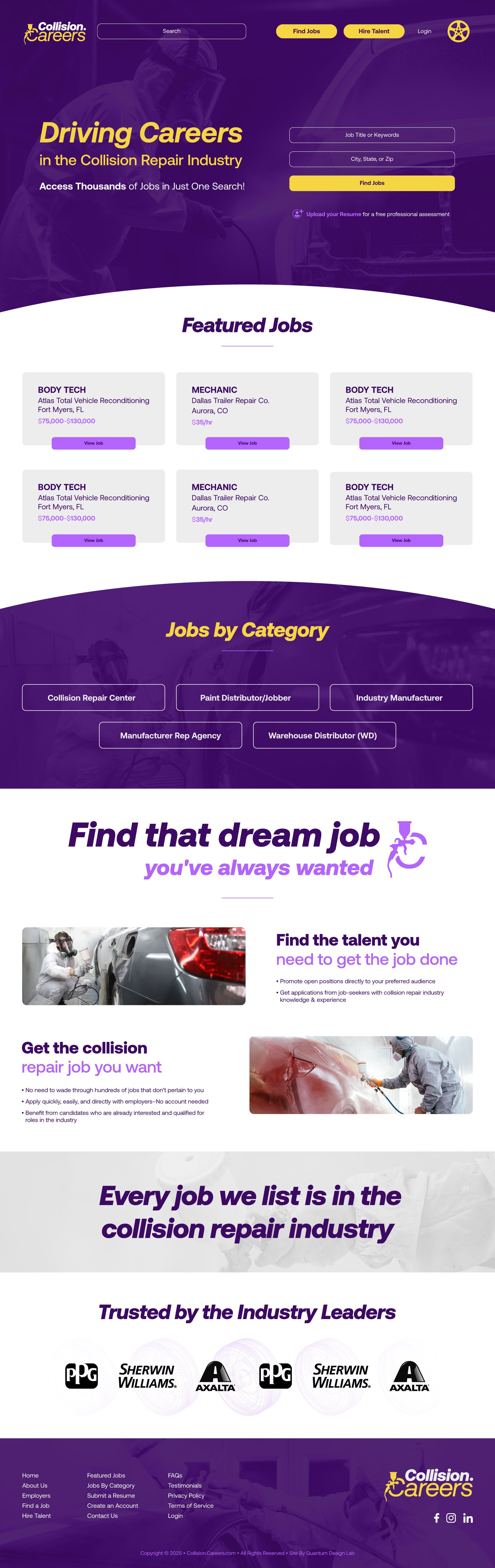 Collision.Careers is a specialized job search platform built for the collision repair industry, created at Quantum Design Labs. As an intern paired directly to the agency’s founder, Chris Anderson, I had the opportunity to contribute to the early conceptualization and execution of the brand and interface. This was an experience that allowed me to participate in high level conversations, propose ideas during the ideation stages, and see many of those ideas integrated into what will be the final product.